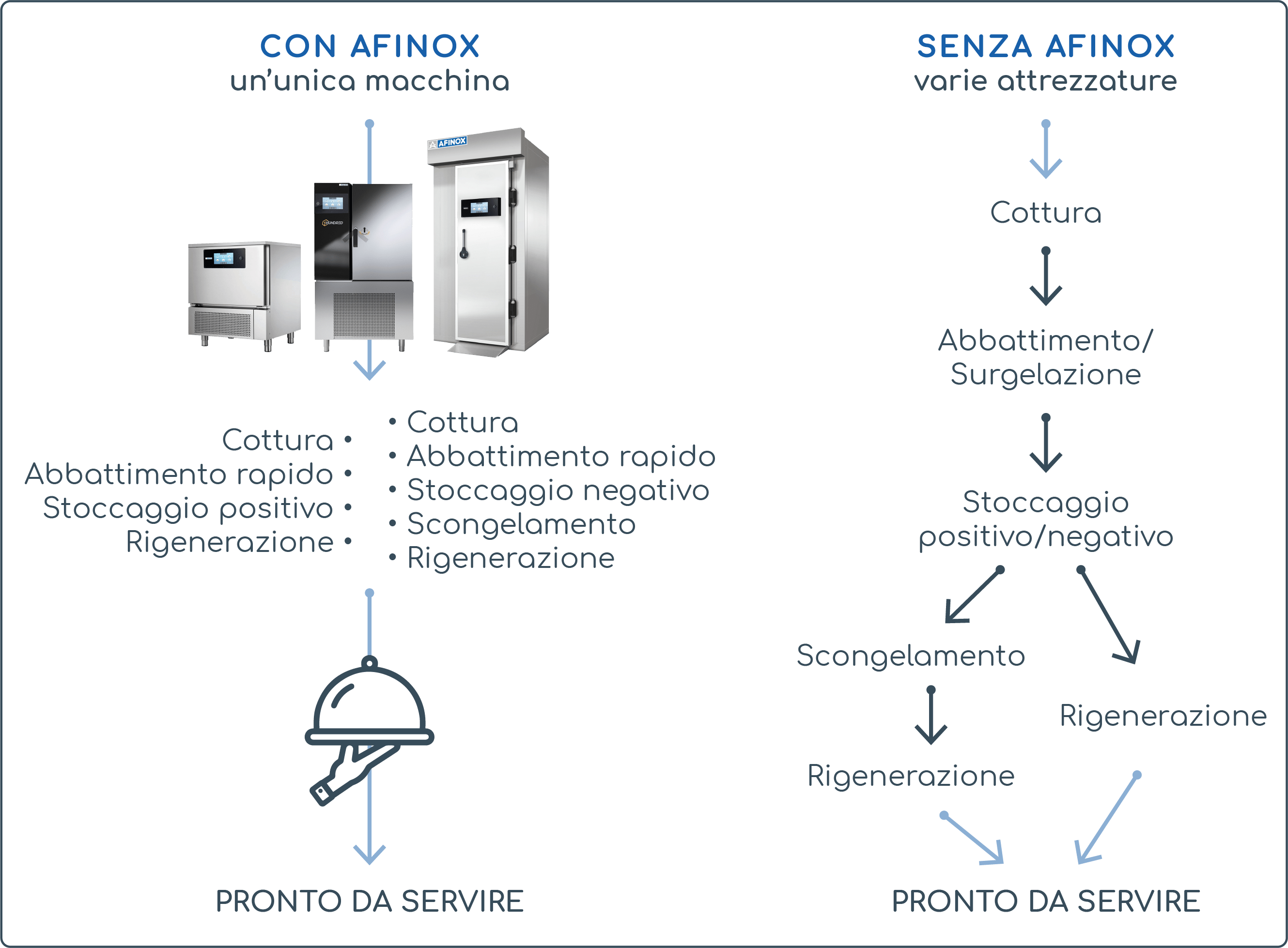 Le attrezzature professionali di Afinox consentono di godere appieno dei vantaggi del cook and chill per preparare, conservare, rigenerare e servire gli alimenti in momenti e fasi distinte, in piena sicurezza, rispettando i vincoli posti dal protocollo HACCP. Grazie alla tecnologia, ottimizzando e standardizzando la produzione e la qualità dei prodotti offerti, è possibile ridurre al minimo il rischio microbiologico ed aumentare la shelf life degli alimenti.