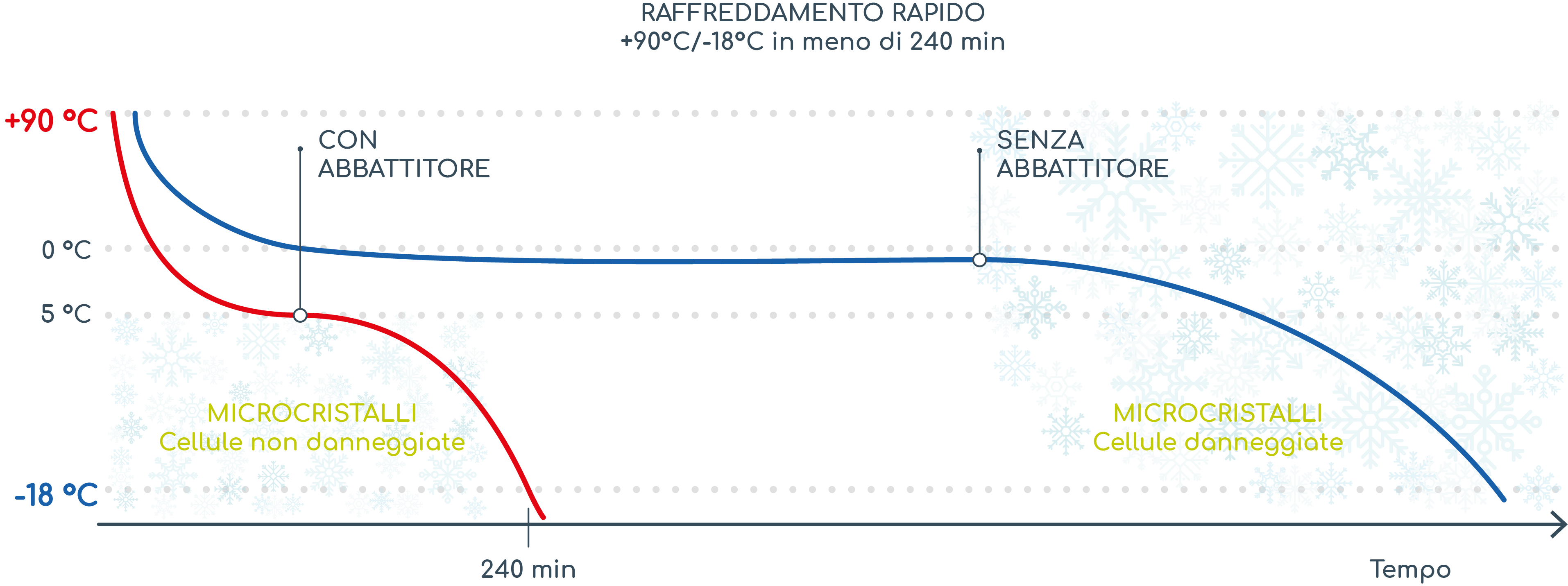 La rapidità con cui avviene il processo di congelamento rapido è essenziale per ottenere la micro-cristallizzazione delle particelle d’acqua contenute nel prodotto. Rispetto alla macro-cristallizzazione, infatti, essa consente: