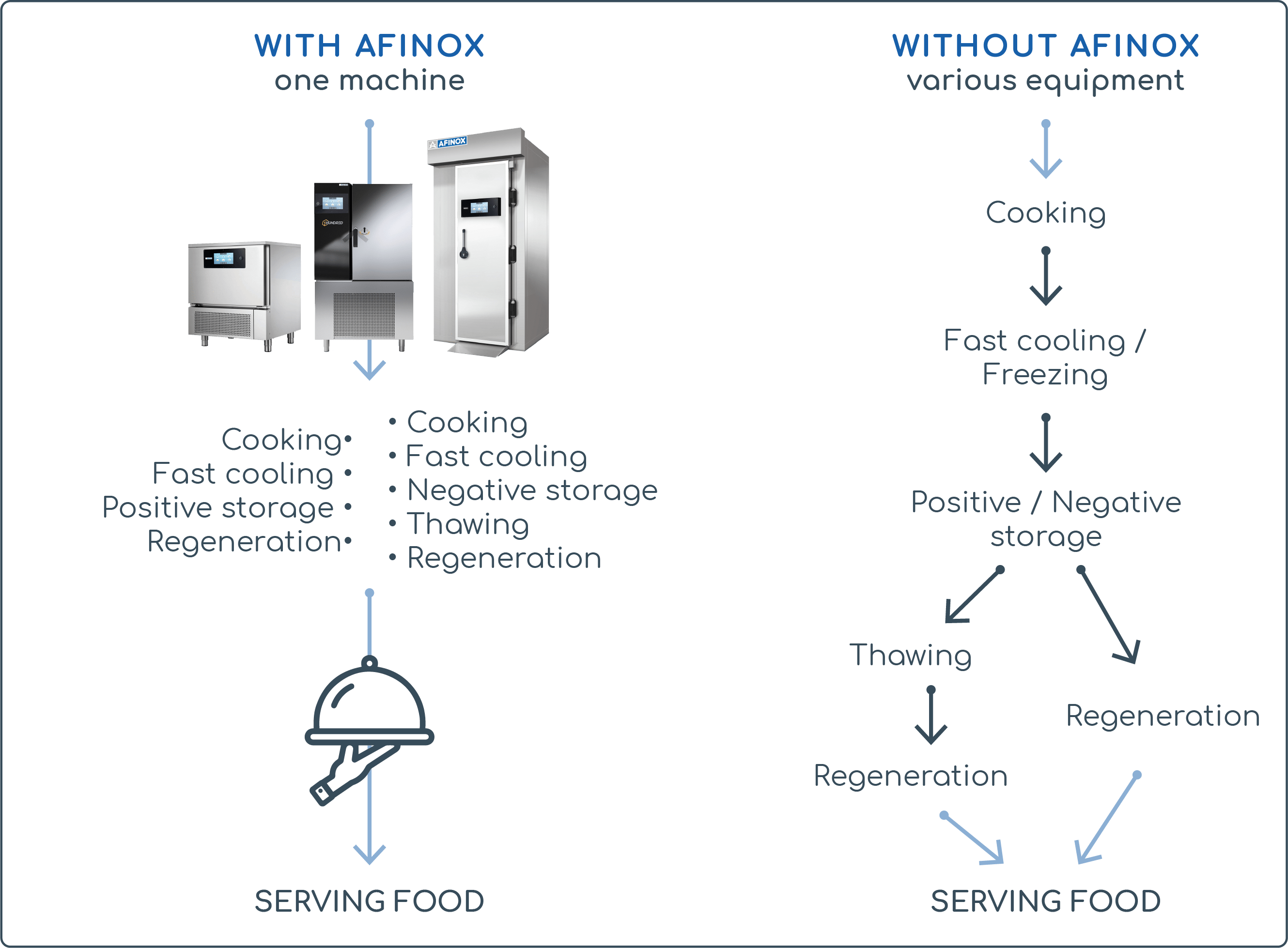 Afinox professional equipment allows you to enjoy the full benefits of cook and chill to prepare, preserve, reconstitute and serve food at distinct times and stages, in complete safety, while complying with the constraints of the HACCP protocol. Thanks to technology, by optimising and standardising production and product quality, it is possible to minimise the microbiological risk and increase the shelf life of food.