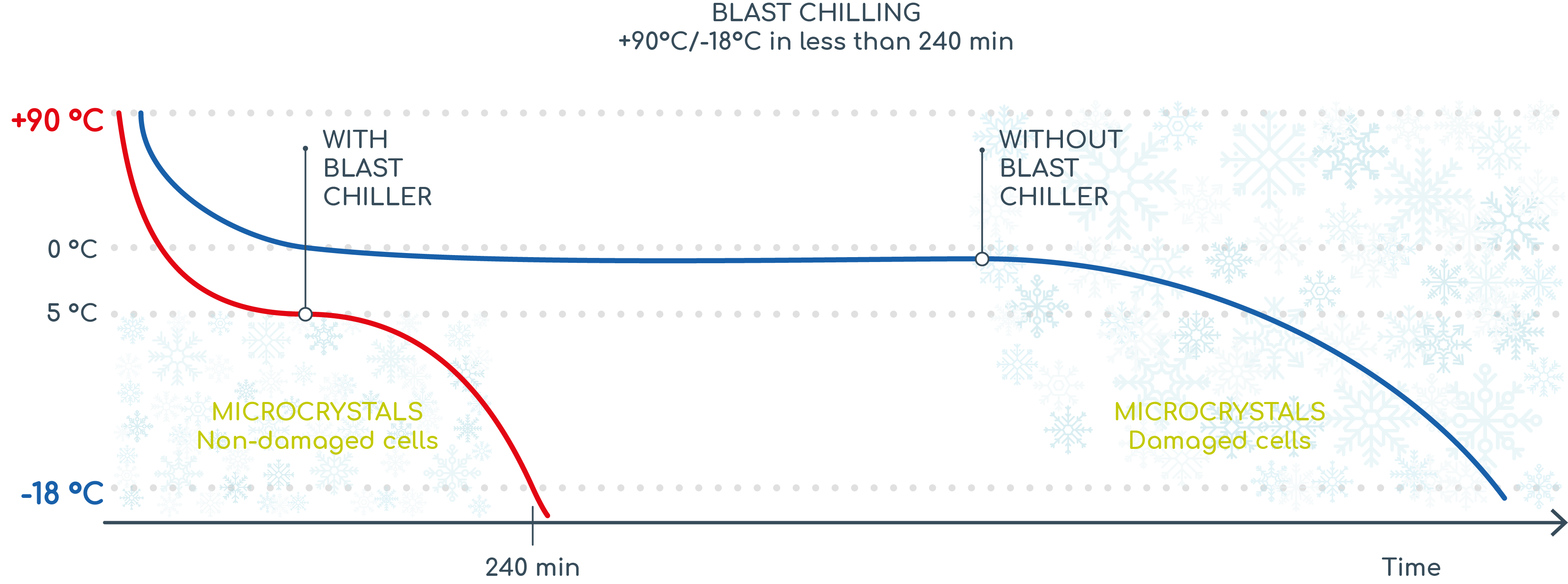 The speed with which the rapid freezing process takes place is essential to achieve micro-crystallisation of the water particles contained in the product. Compared to macro-crystallisation, this allows: