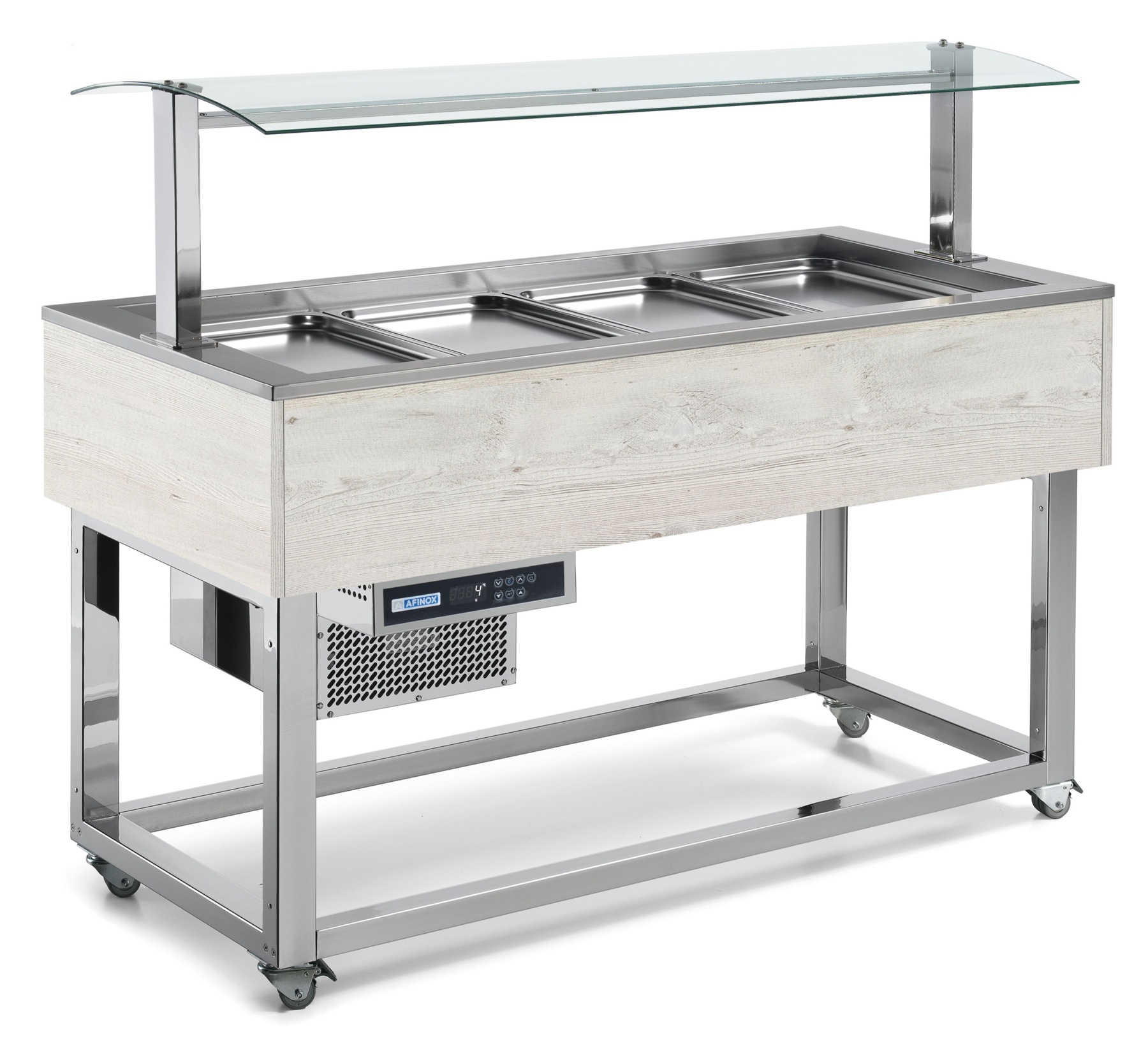 This service system, ideal for fast-moving products, gives its better performance with 200mm deep GN trays and superstructure with heating lamps.