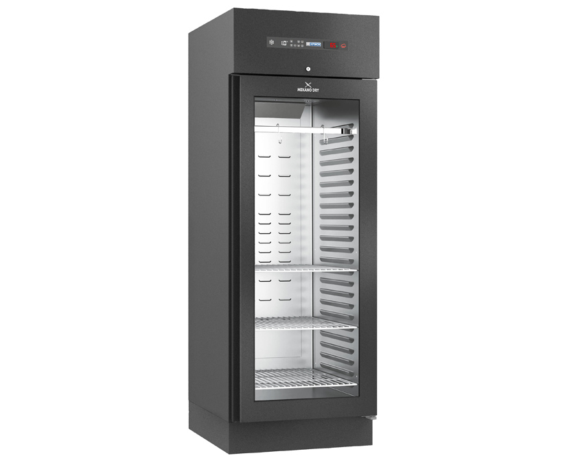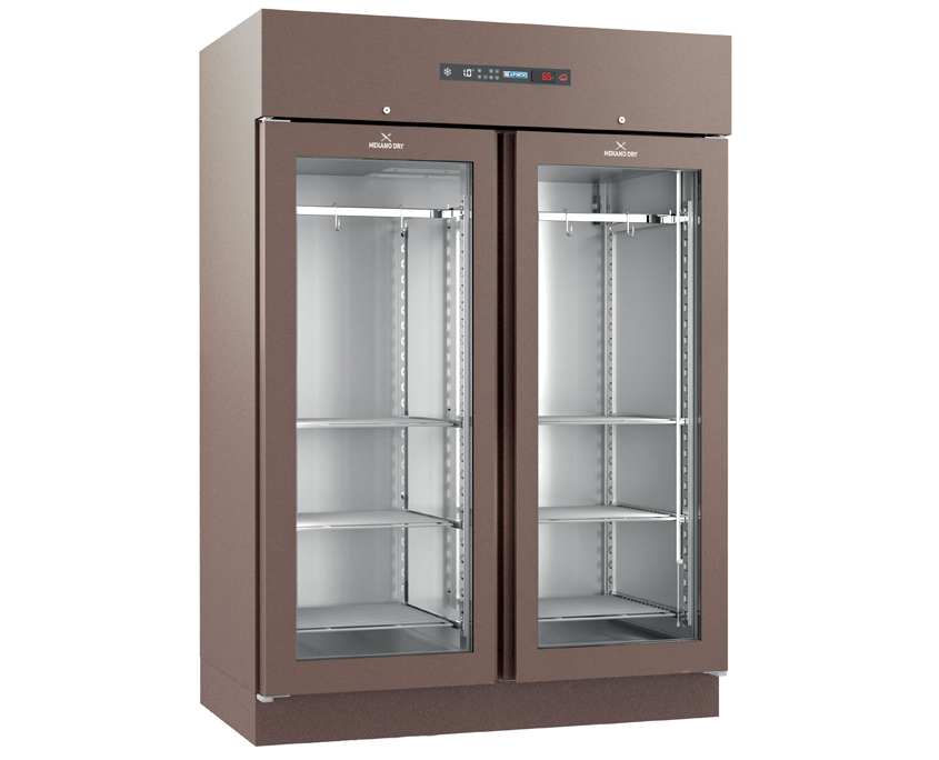 Glass door or full door cabinets for dry aging, equipped with double controller. Dedicated control unit and internal probe for humidity control.