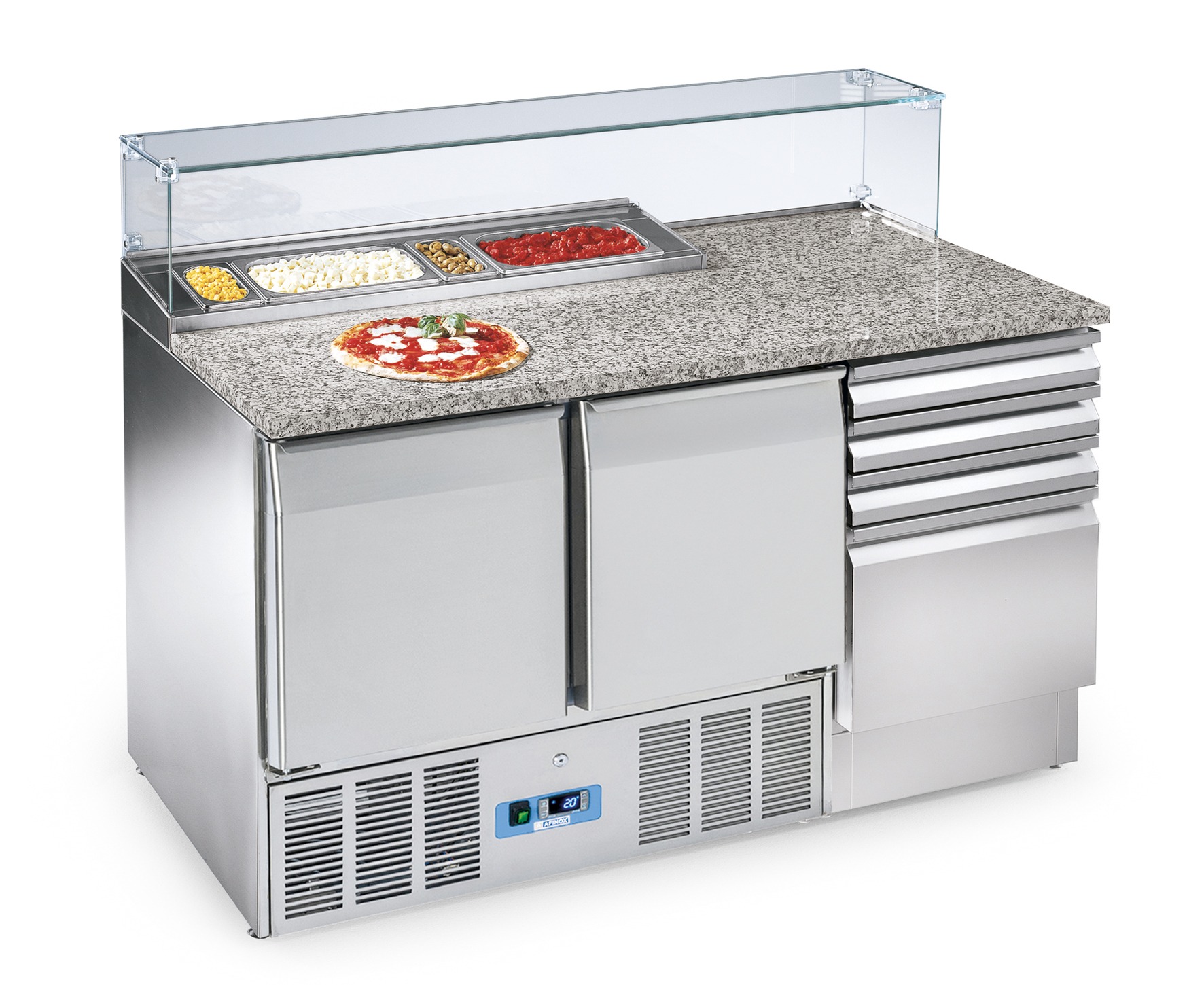 Neutral chests on legs or wheels, granite worktops and superstructures: Afinox has developed a specific pizza counter to meet all pizza makers’ needs.