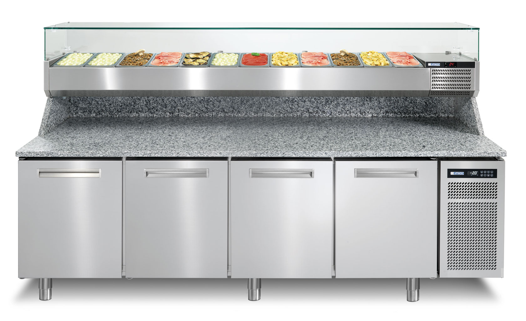 Acounter for preparing pizza with ventilated, safe, reliable and easy-to-clean refrigeration system thanks to: