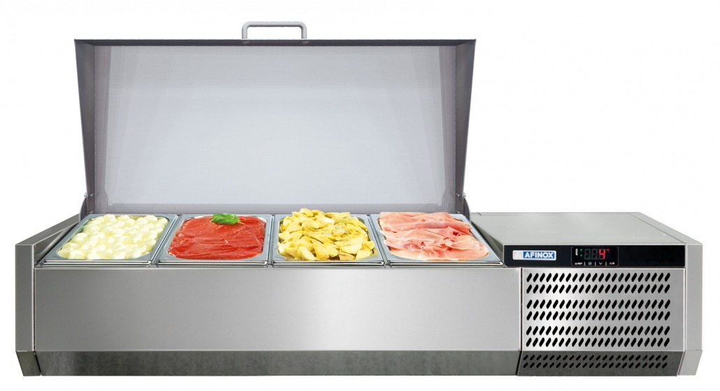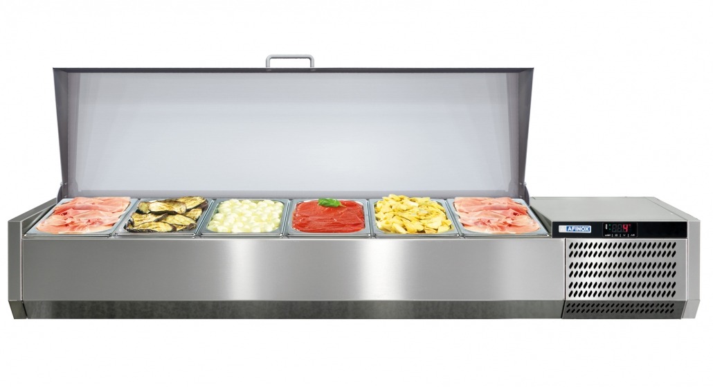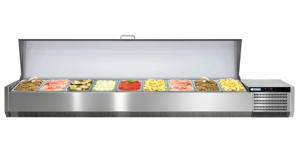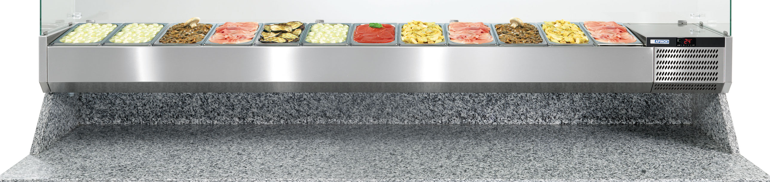The new refrigerated display cabinet for ingredients VRS Plus with depth 395mm (for GN1/3), made of stainless steel AISI 304, thanks to the static refrigeration system, is ideal for keeping the freshness of seasonings and stuffings.