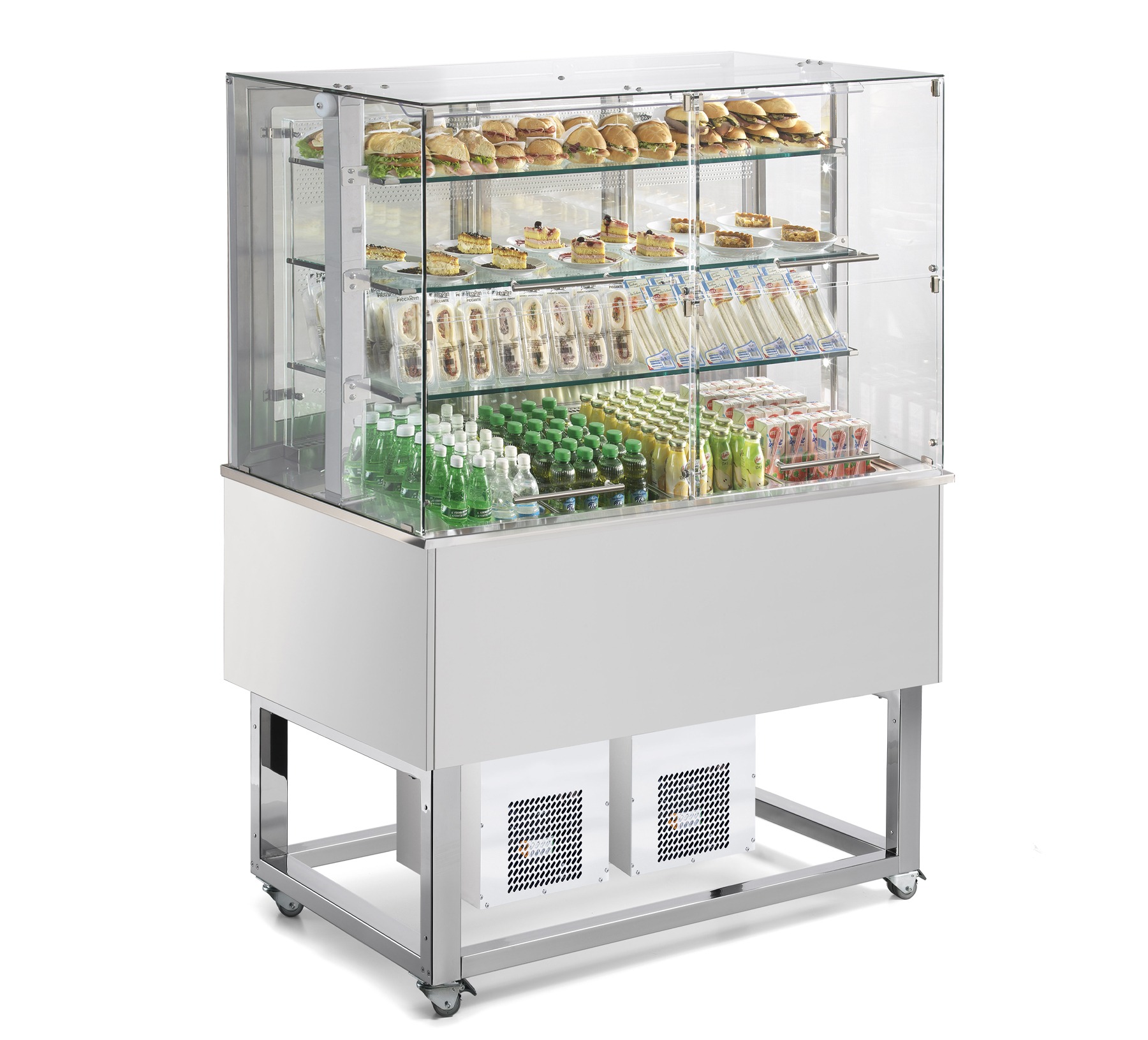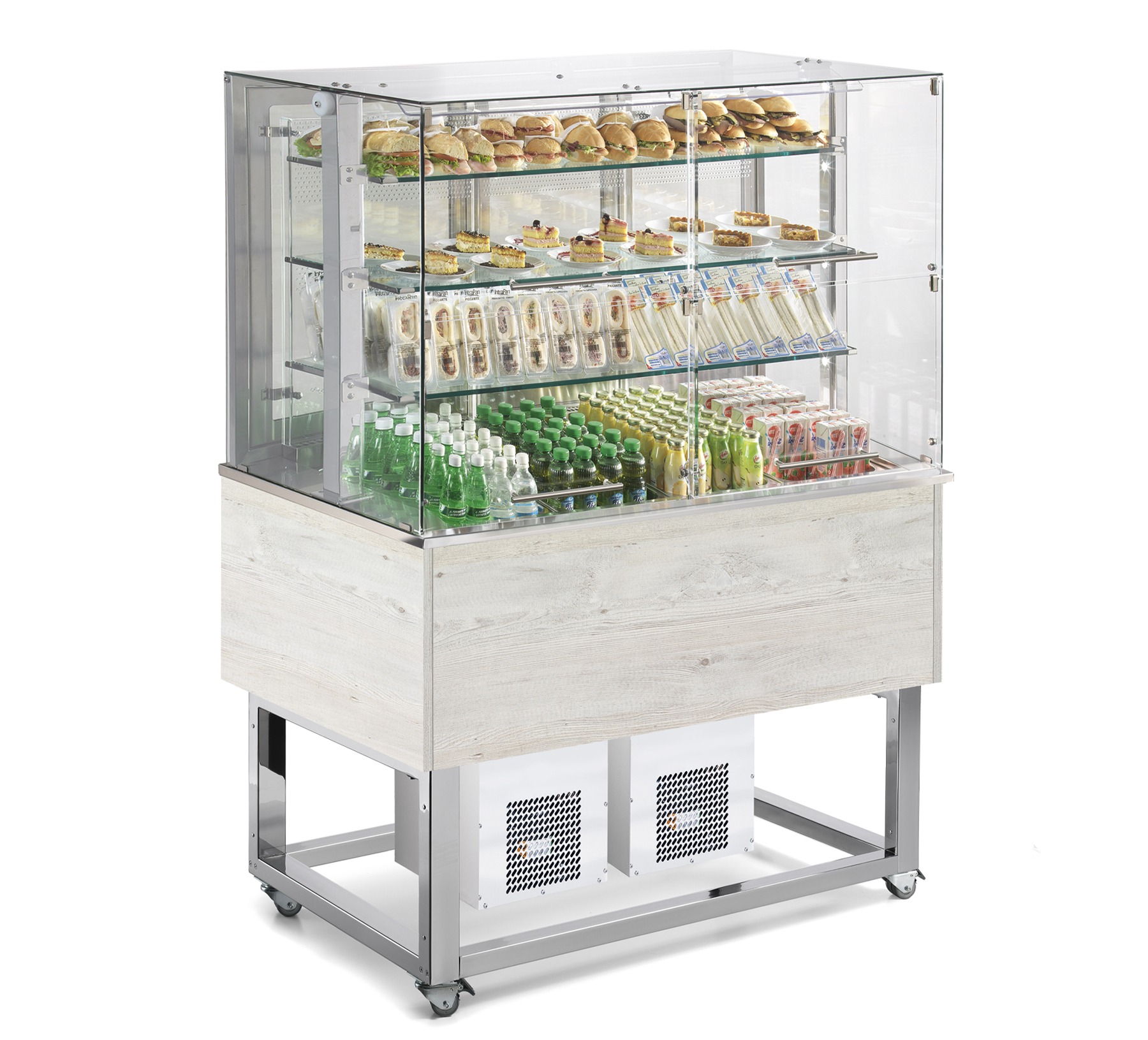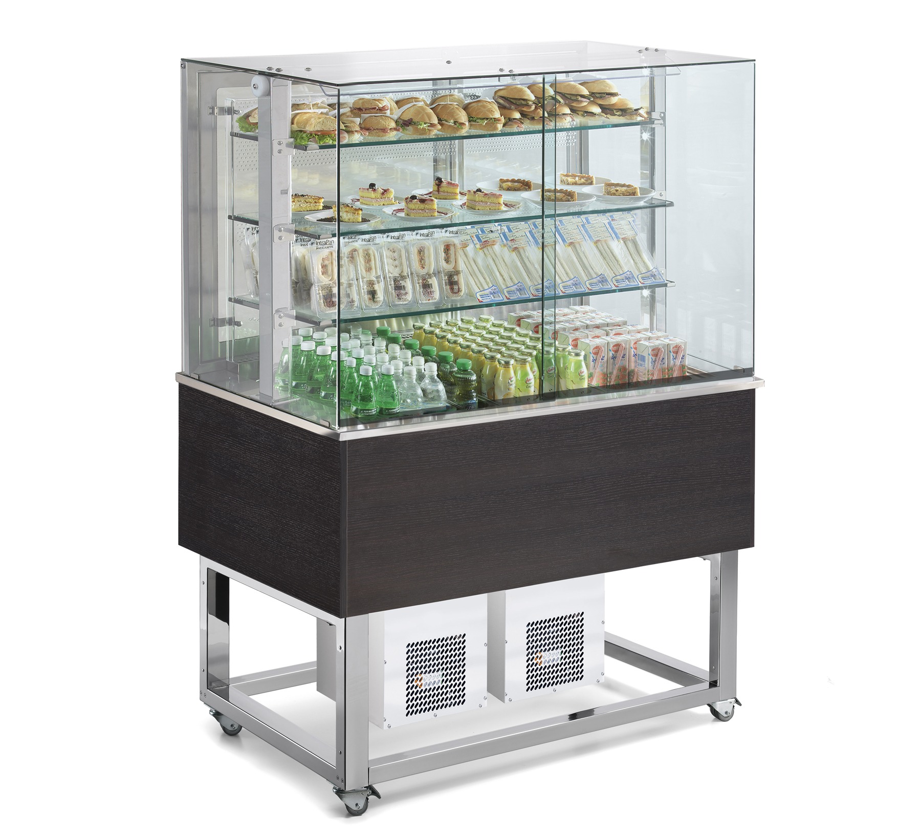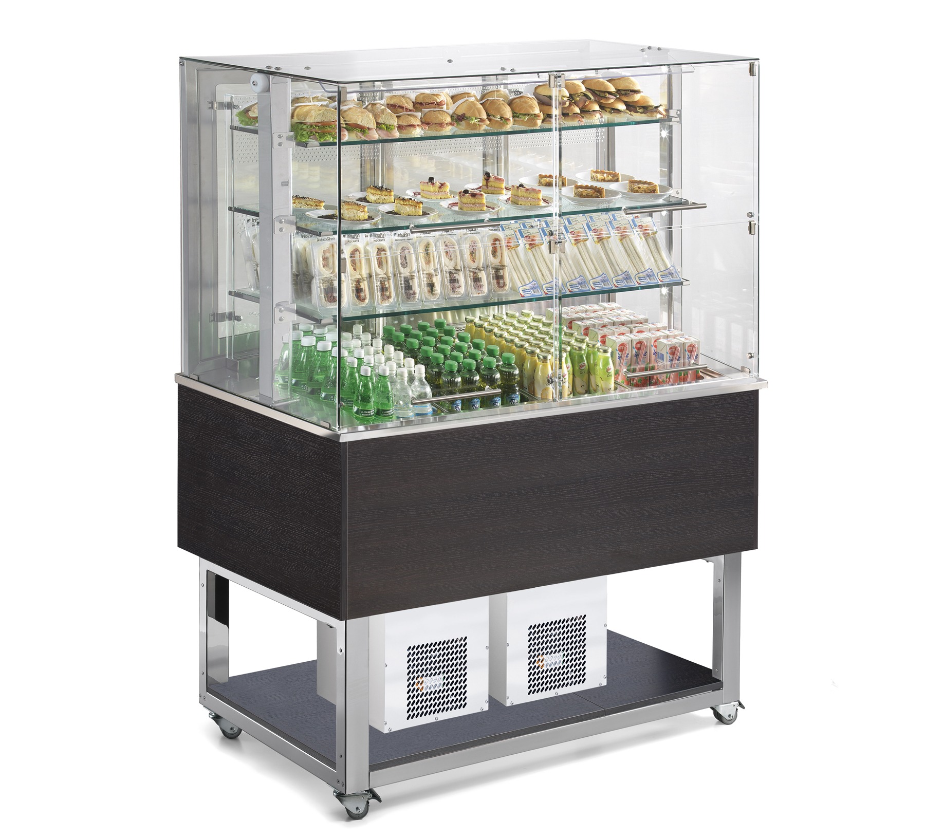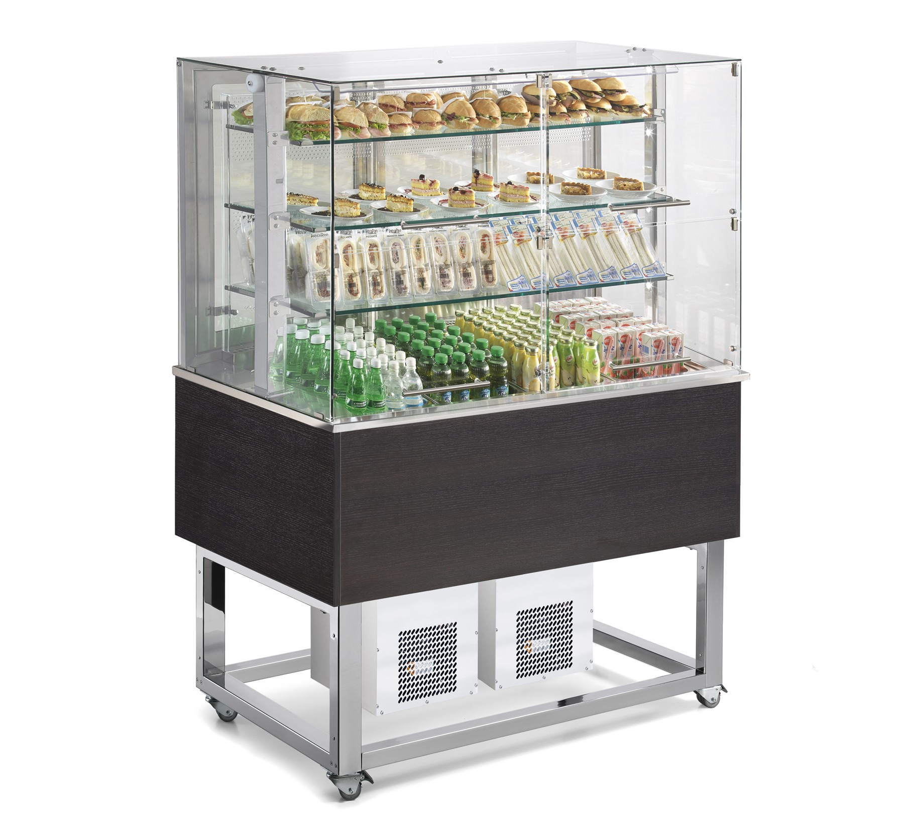 Buffets con vitrina refrigerada ventilada y una robusta estructura en acero cromado sobre ruedas, revestimiento laminado y estructura superior de cristal con iluminación LED.