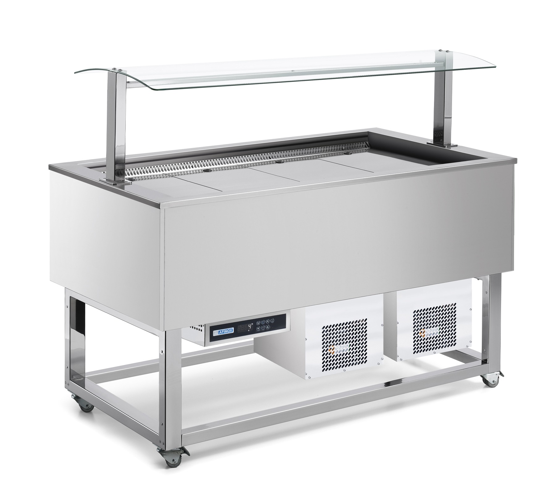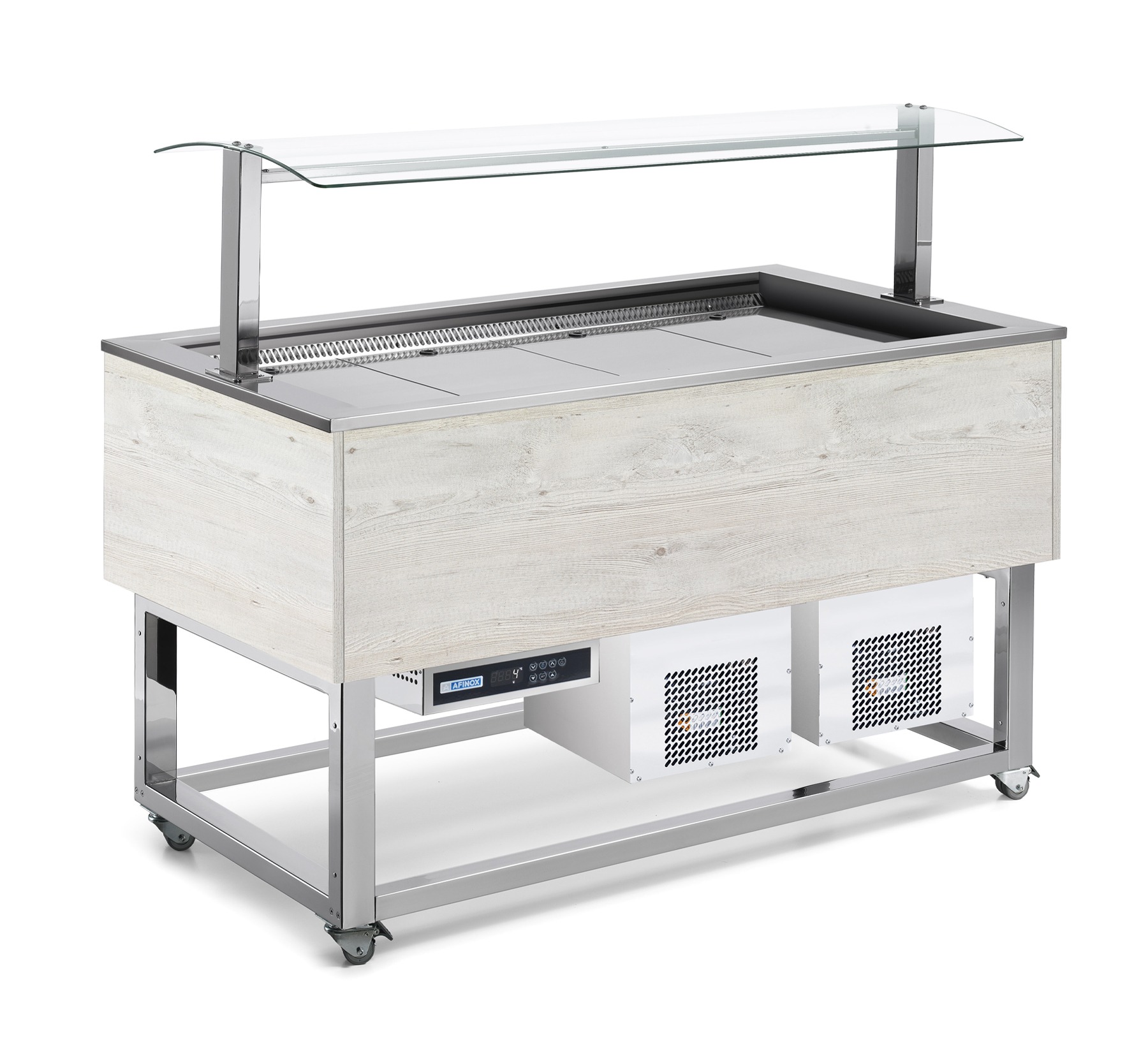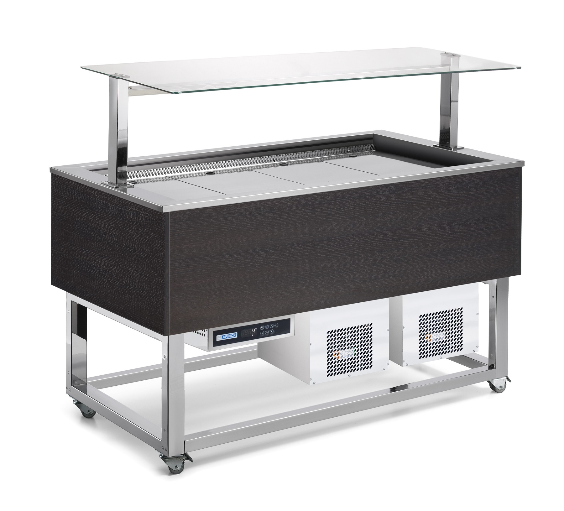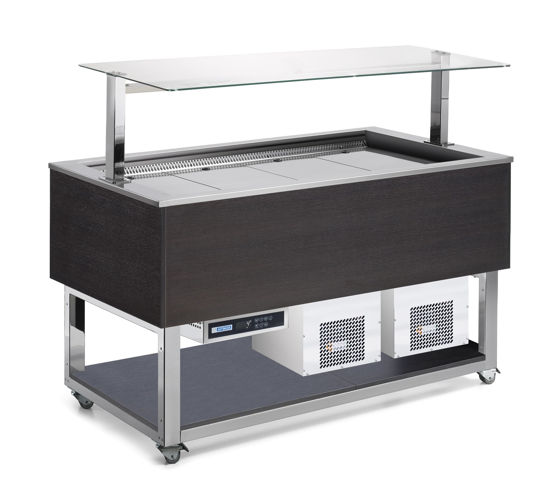 Les buffets réfrigérés à cuves ventilés et à une plaque solide en acier chromé sur les roulettes, revêtement en stratifié et superstructure en verre avec éclairage LED.