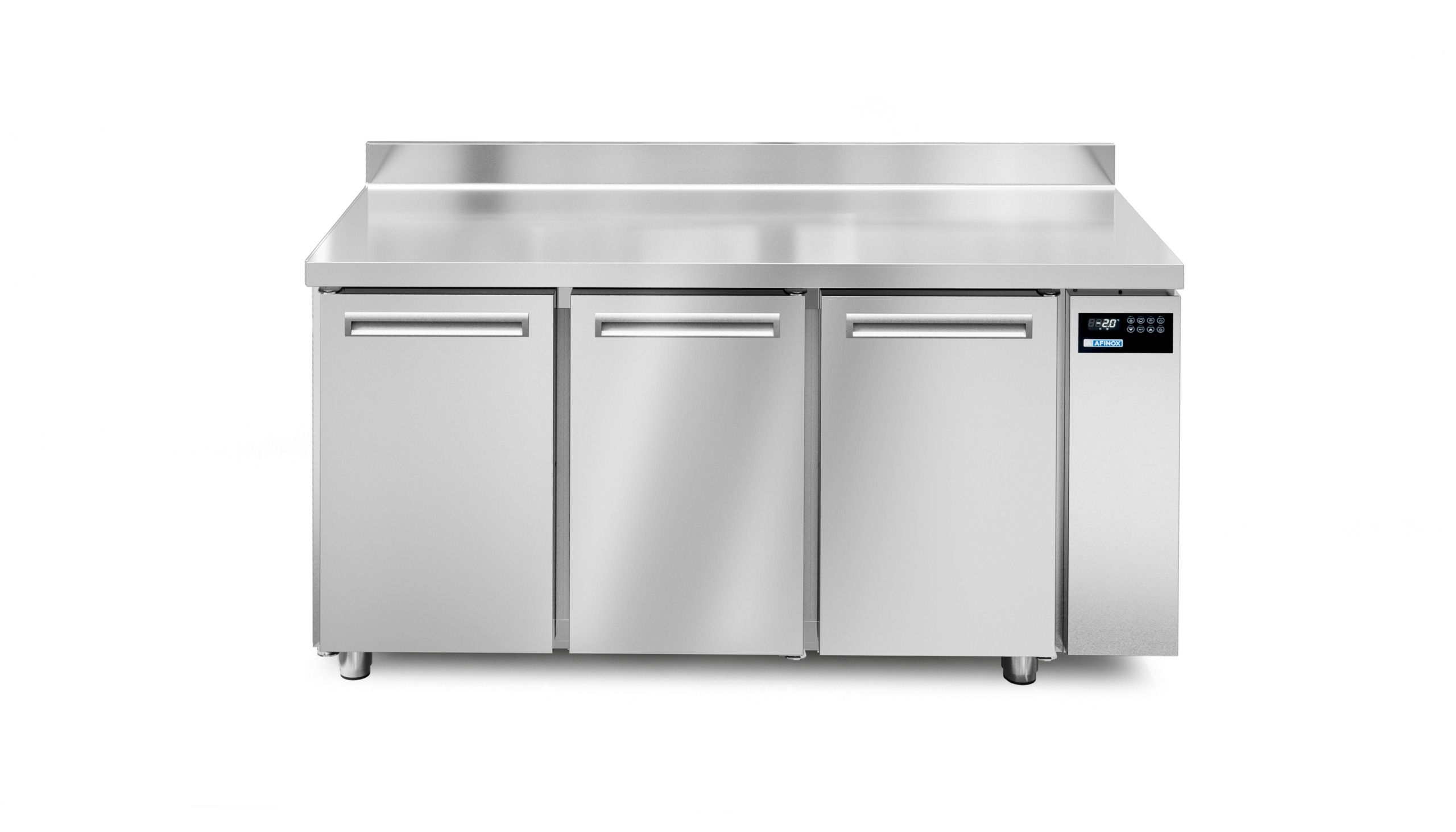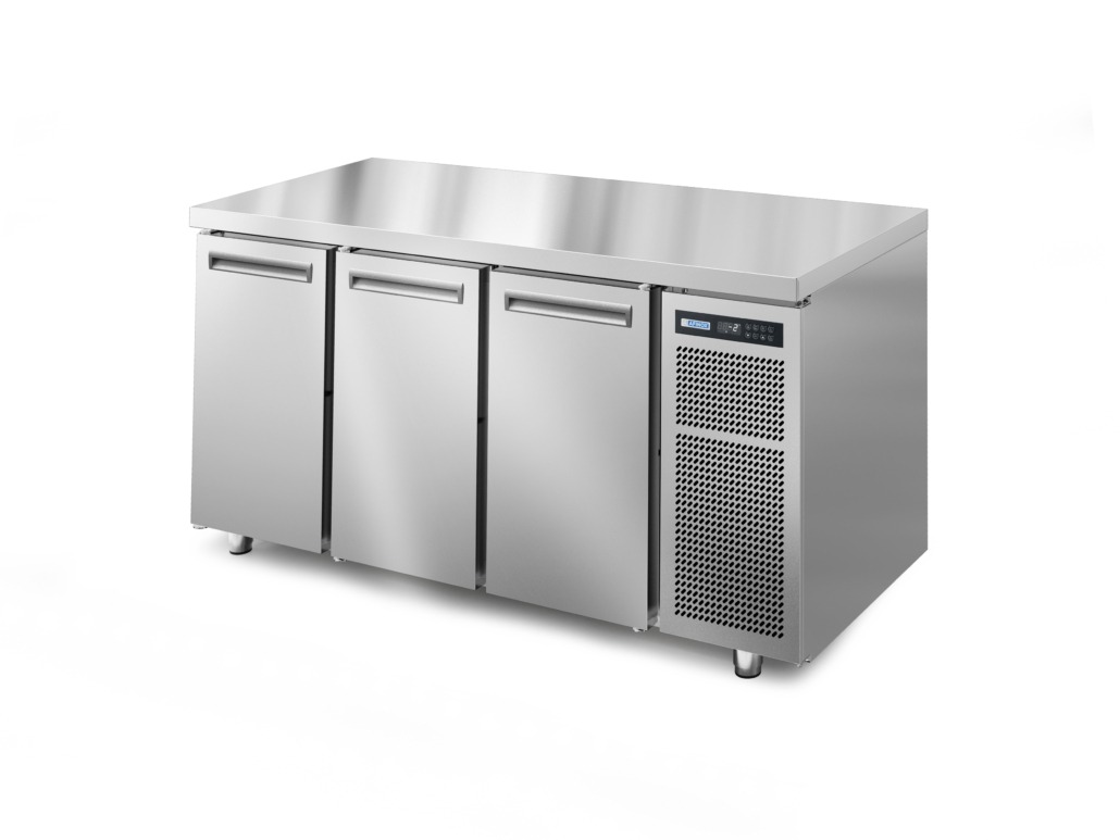 I tavoli refrigerati ventilati per la ristorazione (modelli GN1/1), con profondità 700mm, ALTEZZA SCOCCA 760 MM, isolamento 60mm e maxi altezza maggiorata (h900mm), sono realizzati in acciaio inox AISI 304 e gas refrigerante R290.