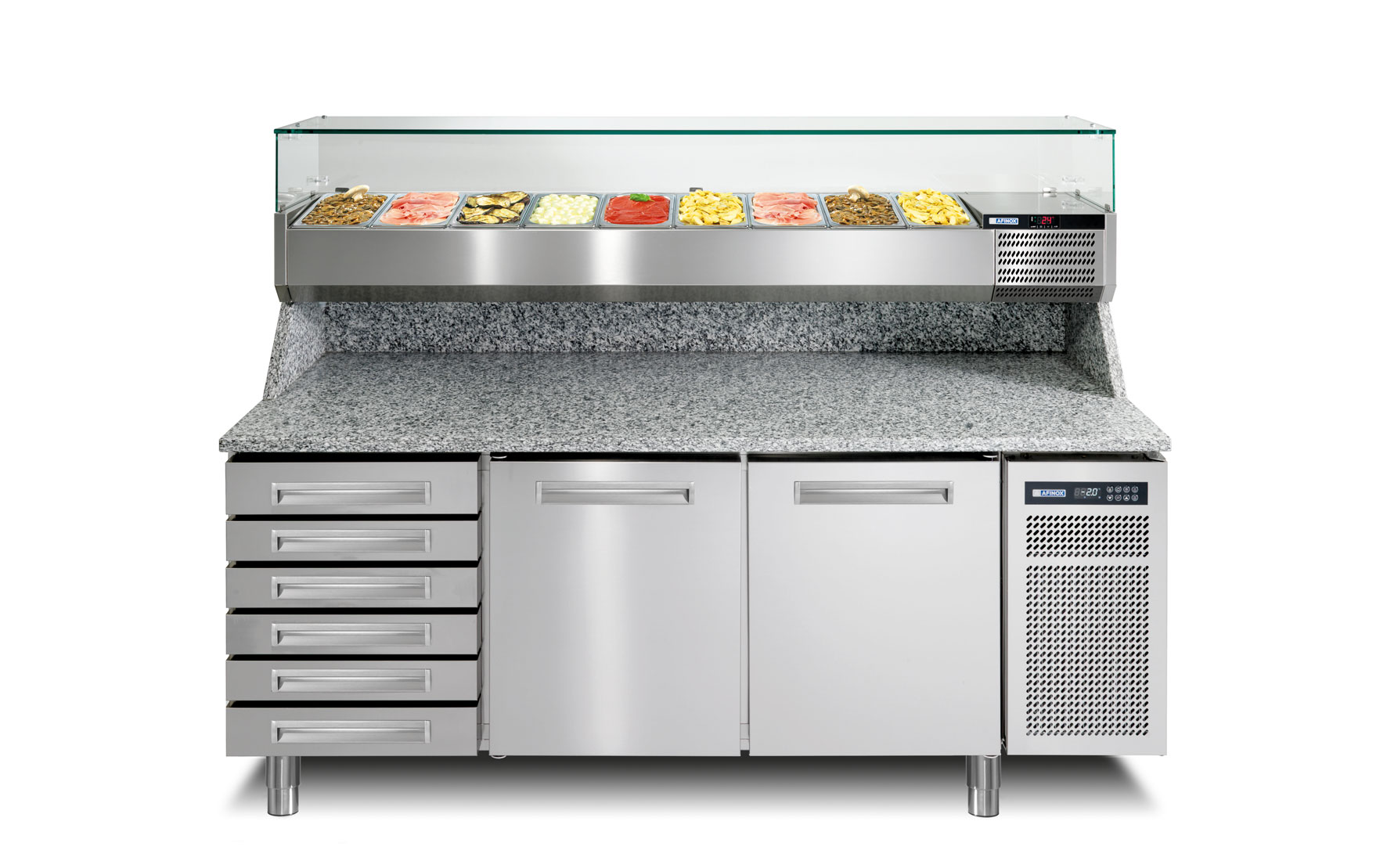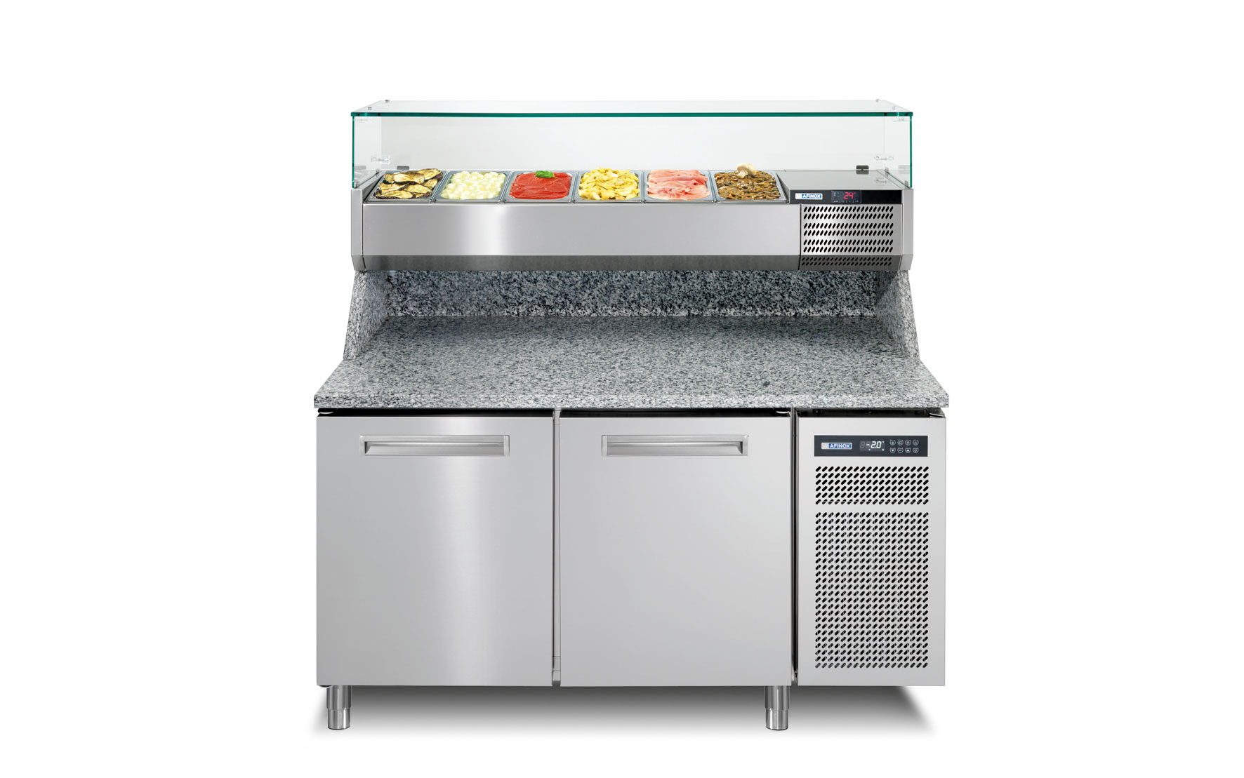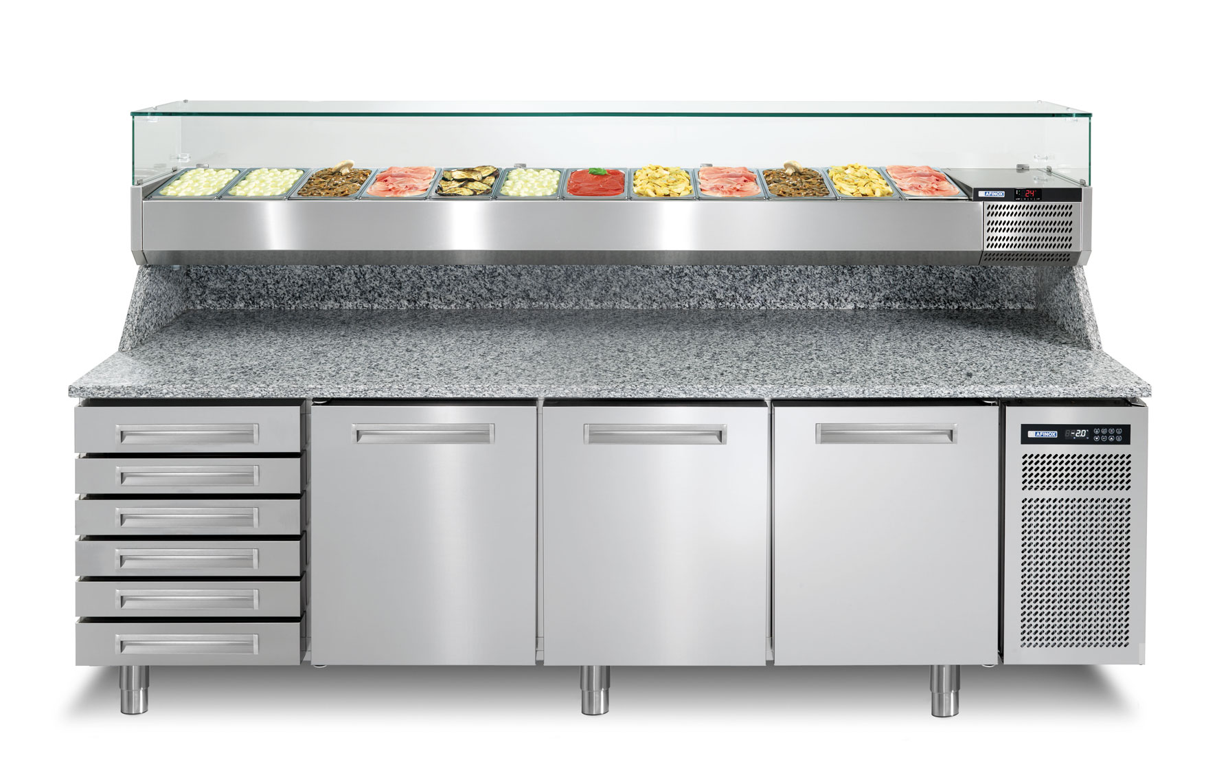 Una famiglia di banchi per la preparazione pizza disponibile in numerose varianti e personalizzazioni, arricchita da sovrastrutture refrigerate, per ingredienti sempre freschi e a portata di mano, cassettiere neutre per un impasto facilmente lavorabile, accessori interni di serie e numerosi optional.