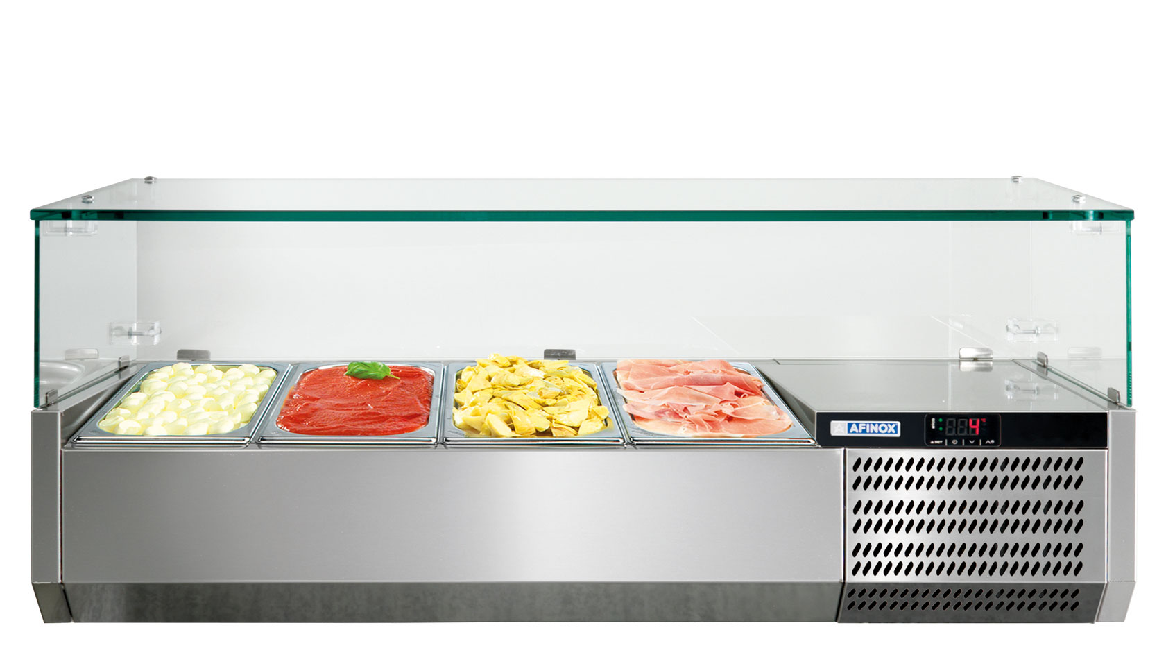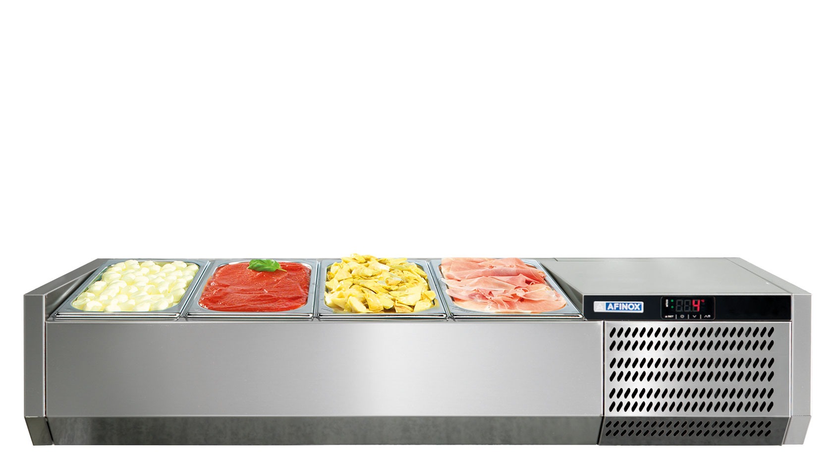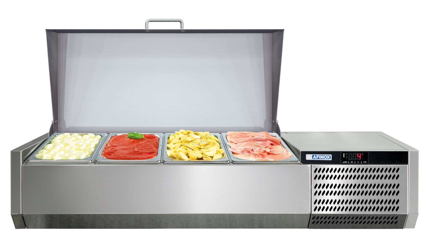La nuova vetrina frigo porta ingredienti VRS Plus con profondità 395mm (per vaschette GN1/3), in acciaio inox AISI 304, grazie al sistema di refrigerazione statica, è l’ideale per conservare al meglio la freschezza di condimenti e farciture.